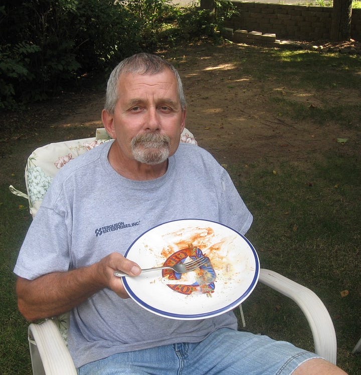 He was happy with simple pleasures. A strong cup of coffee, biscuits & gravy, baked beans, cutting wood, a Sunday drive, a good book, a campfire with all the kids and grands. He was never trying to get or do or be grandiose in anyway.